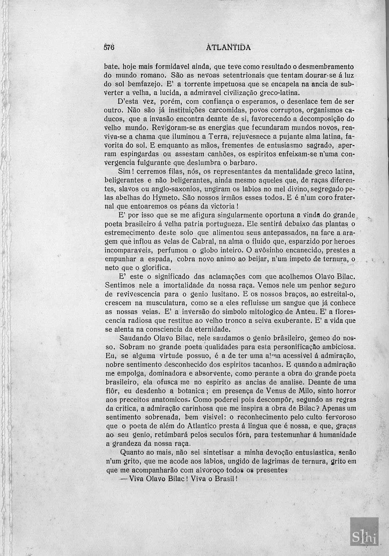 Physical descriptionpp. 569-603SummaryEdição especial da "Revista do Mês" sobre a presença de Olavo Bilac em Lisboa com as seguintes matérias. a) relatos das manifestações populares, do jantar oferecido ao poeta pelo presidente de Portugal e da cobertura da imprensa (p. 569); b) extrato do discurso pronunciado por Olavo Bilac na Academia de Ciências de Lisboa (pp. 570-574); c) o banquete oferecido pela Atlantida a Olavo Bilac, manifestações de intelectuais presentes e discursos de: 1. Henrique Lopes de Mendonça (pp. 575-576); 2. José Antônio de Freitas (p. 577); 3. Jaime Cortesão (p. 578); 4. Alexandre Braga (pp. 579-580); 5. Alberto de Oliveira (pp. 581-584); 6. Veloso Rebelo (pp. 585-586); 7. Sousa Bandeira (p. 587); 8. João de Barros (pp. 588-589), 9. Joaquim Pedro Martins (p. 590); 10. Olavo Bilac (pp. 591-596); d) assistência e manifestações de apoio ao banquete da Atlantida (p. 596); e) saudação de Guerra Junqueiro, precedente à conferência de 3 de abril de 1916 (pp. 597-599); f) conferência de Olavo Bilac no teatro República, em 3 de abril de 1916 (pp. 599-602); g) discurso de Coelho de Carvalho na recepção na Academia das Ciências de Lisboa (pp. 602-603).NotesMatéria ilustrada com fotografias de flagrantes da passagem de Olavo Bilac pela capital portuguesa, do banquete oferecido pela Atlantida, e um desenho do perfil do poeta.ConceptsSubjectsSingle Names RefCollective Names RefWorks