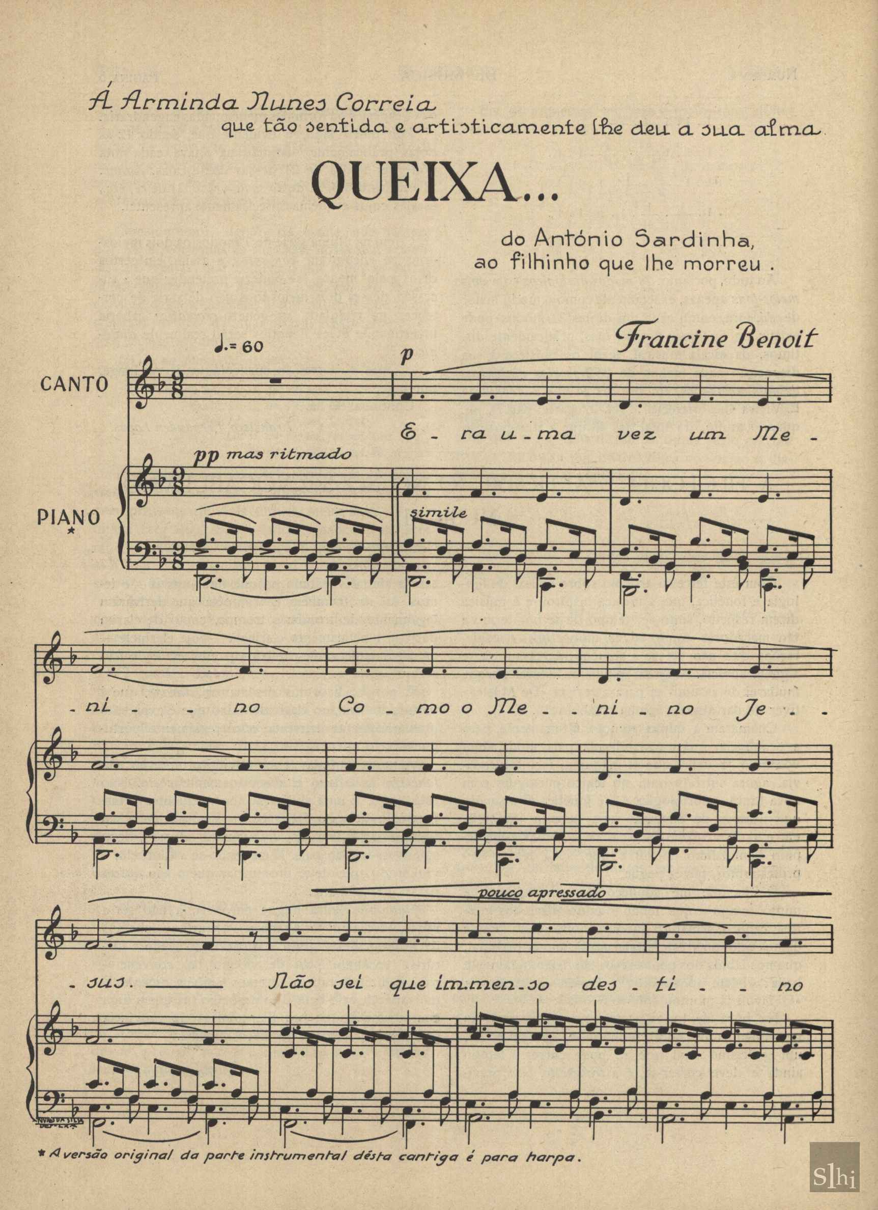 Dedicatória a Arminda Correia (cantora). Indicação de que a versão original do acompanhamento é para harpa.