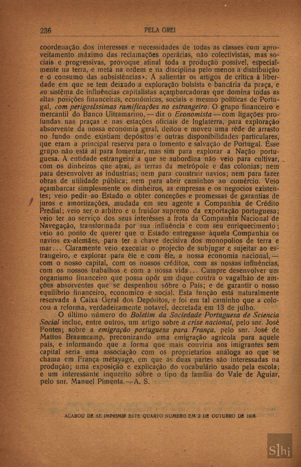 N.º 42 de Outubro de 1918 Physical descriptionpp. 223-236SummaryConjunto de textos sobre a actualidade político-social e reacções a textos anteriormente publicados em que se abordam diversos temas: Pós-guerra e o empobrecimento agrícola; Crítica à Igreja e defesa de bons valores estrangeiros; Opiniões sobre a nova geração; Proposta de transformação da sociedade por parte do partido trabalhista inglês.ConceptsSubjectsSingle Names RefCollective Names RefWorksGeographic Names