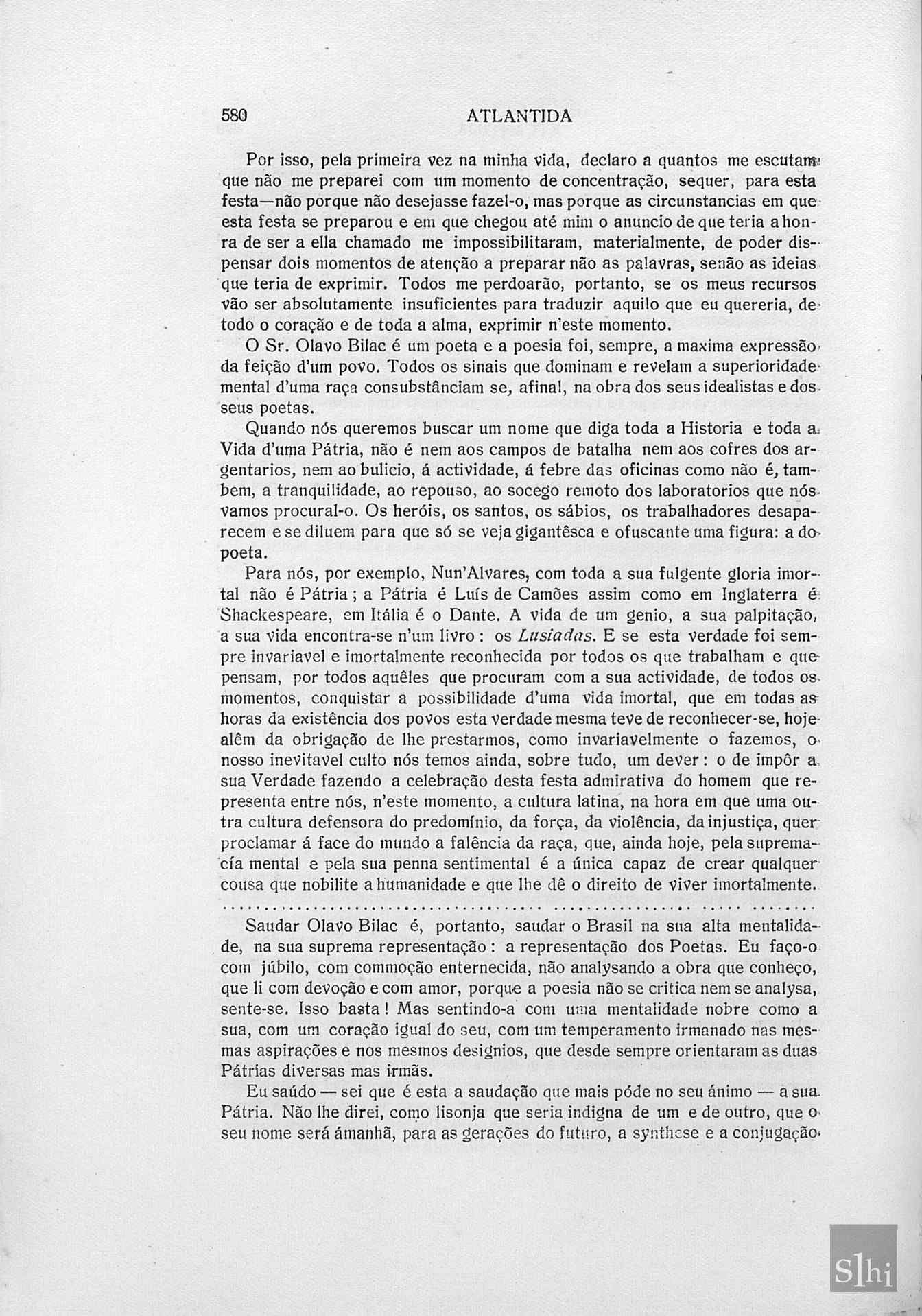 Descrição físicapp. 569-603SumárioEdição especial da "Revista do Mês" sobre a presença de Olavo Bilac em Lisboa com as seguintes matérias. a) relatos das manifestações populares, do jantar oferecido ao poeta pelo presidente de Portugal e da cobertura da imprensa (p. 569); b) extrato do discurso pronunciado por Olavo Bilac na Academia de Ciências de Lisboa (pp. 570-574); c) o banquete oferecido pela Atlantida a Olavo Bilac, manifestações de intelectuais presentes e discursos de: 1. Henrique Lopes de Mendonça (pp. 575-576); 2. José Antônio de Freitas (p. 577); 3. Jaime Cortesão (p. 578); 4. Alexandre Braga (pp. 579-580); 5. Alberto de Oliveira (pp. 581-584); 6. Veloso Rebelo (pp. 585-586); 7. Sousa Bandeira (p. 587); 8. João de Barros (pp. 588-589), 9. Joaquim Pedro Martins (p. 590); 10. Olavo Bilac (pp. 591-596); d) assistência e manifestações de apoio ao banquete da Atlantida (p. 596); e) saudação de Guerra Junqueiro, precedente à conferência de 3 de abril de 1916 (pp. 597-599); f) conferência de Olavo Bilac no teatro República, em 3 de abril de 1916 (pp. 599-602); g) discurso de Coelho de Carvalho na recepção na Academia das Ciências de Lisboa (pp. 602-603).NotasMatéria ilustrada com fotografias de flagrantes da passagem de Olavo Bilac pela capital portuguesa, do banquete oferecido pela Atlantida, e um desenho do perfil do poeta.ConceitosAssuntosNomes Singulares CitadosNomes Colectivos CitadosObras
