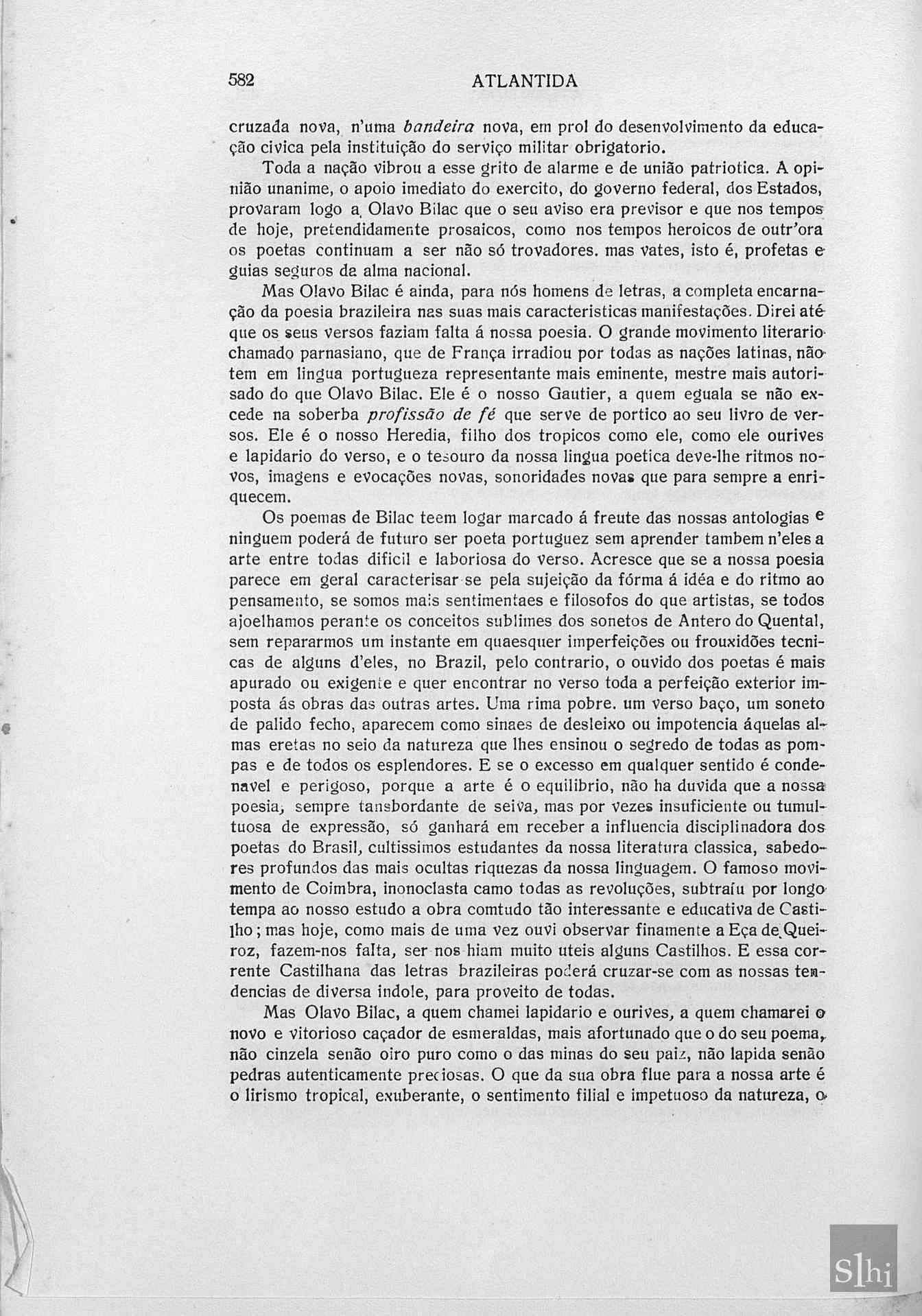 Descrição físicapp. 569-603SumárioEdição especial da "Revista do Mês" sobre a presença de Olavo Bilac em Lisboa com as seguintes matérias. a) relatos das manifestações populares, do jantar oferecido ao poeta pelo presidente de Portugal e da cobertura da imprensa (p. 569); b) extrato do discurso pronunciado por Olavo Bilac na Academia de Ciências de Lisboa (pp. 570-574); c) o banquete oferecido pela Atlantida a Olavo Bilac, manifestações de intelectuais presentes e discursos de: 1. Henrique Lopes de Mendonça (pp. 575-576); 2. José Antônio de Freitas (p. 577); 3. Jaime Cortesão (p. 578); 4. Alexandre Braga (pp. 579-580); 5. Alberto de Oliveira (pp. 581-584); 6. Veloso Rebelo (pp. 585-586); 7. Sousa Bandeira (p. 587); 8. João de Barros (pp. 588-589), 9. Joaquim Pedro Martins (p. 590); 10. Olavo Bilac (pp. 591-596); d) assistência e manifestações de apoio ao banquete da Atlantida (p. 596); e) saudação de Guerra Junqueiro, precedente à conferência de 3 de abril de 1916 (pp. 597-599); f) conferência de Olavo Bilac no teatro República, em 3 de abril de 1916 (pp. 599-602); g) discurso de Coelho de Carvalho na recepção na Academia das Ciências de Lisboa (pp. 602-603).NotasMatéria ilustrada com fotografias de flagrantes da passagem de Olavo Bilac pela capital portuguesa, do banquete oferecido pela Atlantida, e um desenho do perfil do poeta.ConceitosAssuntosNomes Singulares CitadosNomes Colectivos CitadosObras