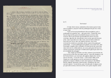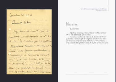 De Fernando Lopes Graça a Pedro do Prado, 20 de Janeiro de 1936Carta de Fernando Lopes Graça a Pedro do Prado com pedido para que lhe envie dois números de De Música e de Seara Nova para reunir material para livro de ensaios que estava a preparar.Fernando Lopes Graça, Espólio Pedro do Prado, Cota MNM-1995-0002-0579, Museu Nacional da Música, 20 de Janeiro de 1936.